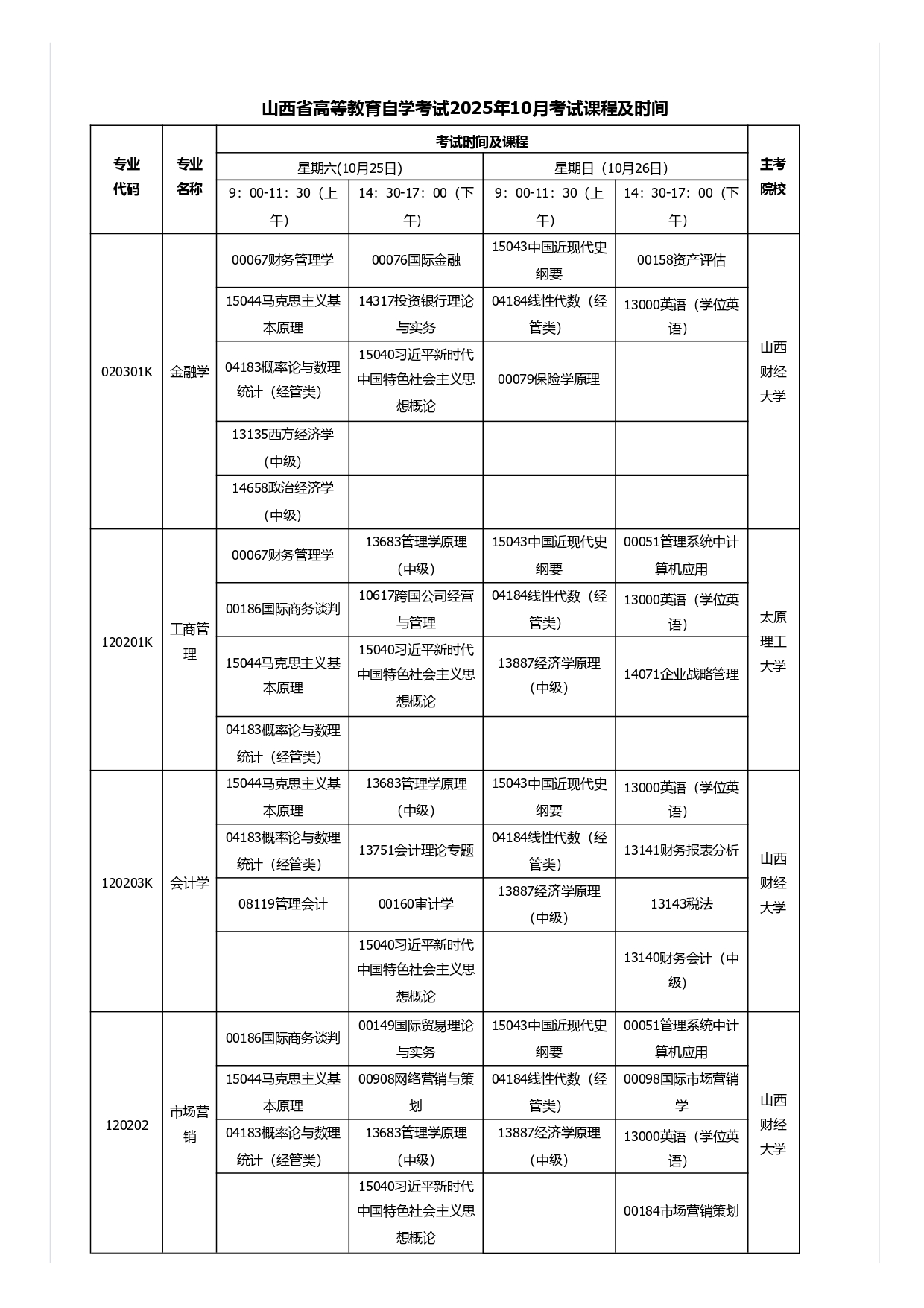 山西省高等教育自学考试2025年10月考试课程及时间安排